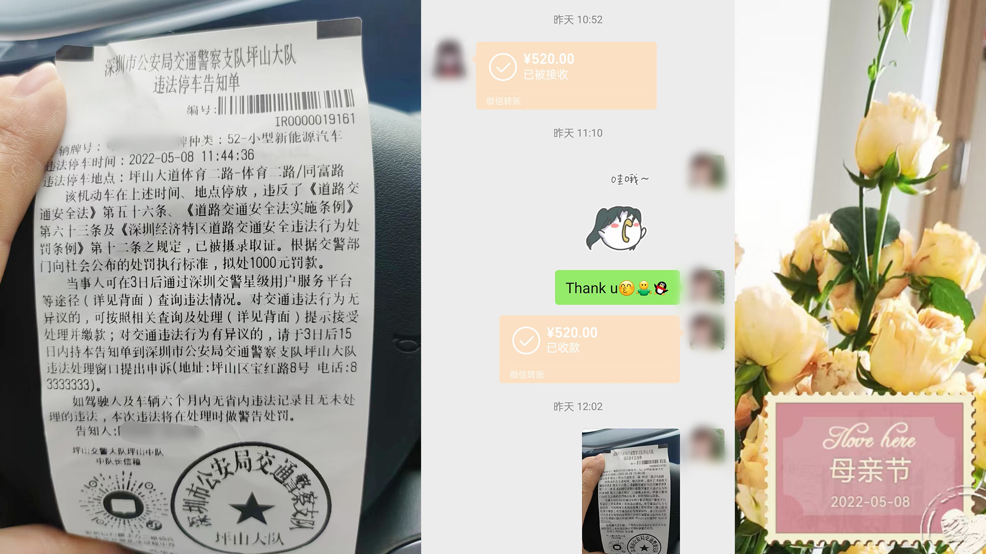 這次母親節(jié)活動(dòng)我有點(diǎn)不解,不僅微信紅包的金額沒有擴(kuò)大,還沒有默認(rèn)紅包母親節(jié)快樂的祝福語,但是這也阻擋不了對母親的愛。下面這位母親在母親節(jié)收到了520的轉(zhuǎn)賬,但是出了點(diǎn)意外,母親節(jié)外出和朋友聚餐,不小心違反了交通規(guī)則,收到了違法停車告知單,被罰1000元罰款。我認(rèn)為這位母親也是收到了最好的禮物,畢竟我看大部分人都只是發(fā)紅包,這個(gè)轉(zhuǎn)賬最直觀的表達(dá):我愛你,母親!
