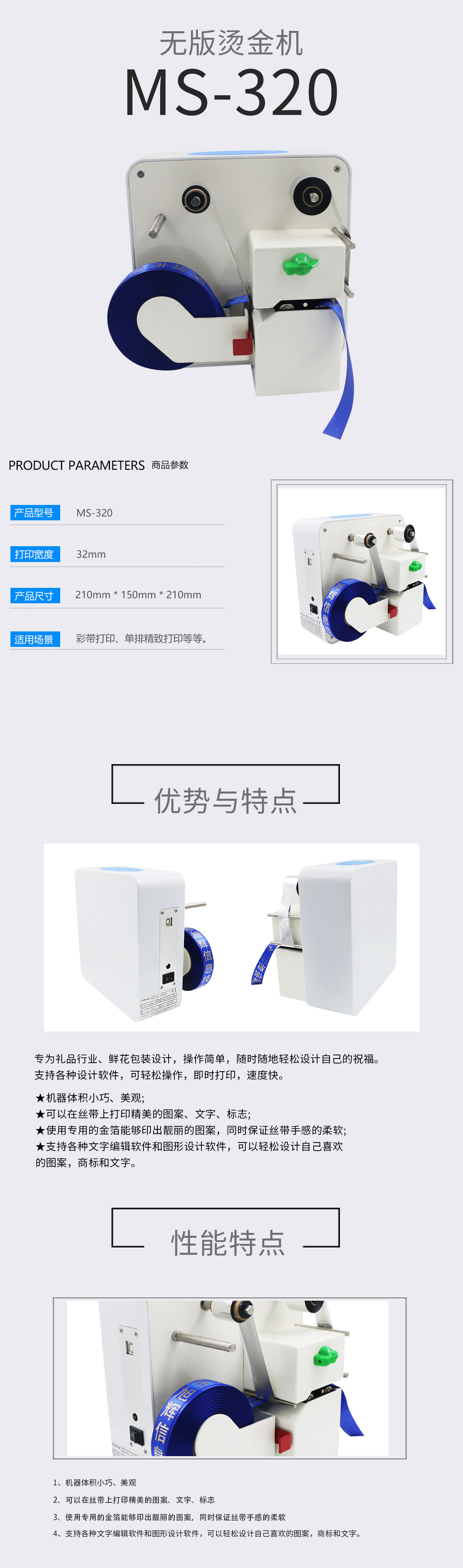 美松全自動(dòng)絲印機(jī) 1.機(jī)器體積小巧,美觀(桌面擺設(shè)) 2.速度快(是普通打印機(jī)的5倍) 3.在絲帶上打印精美的圖案,文字,標(biāo)志 4.使用專用的金箔能夠印出靚麗的圖案,同時(shí)保證絲帶手感的柔軟 5.支持各種文字編輯軟件和圖形設(shè)計(jì)軟件,自定義打印商標(biāo)和文字