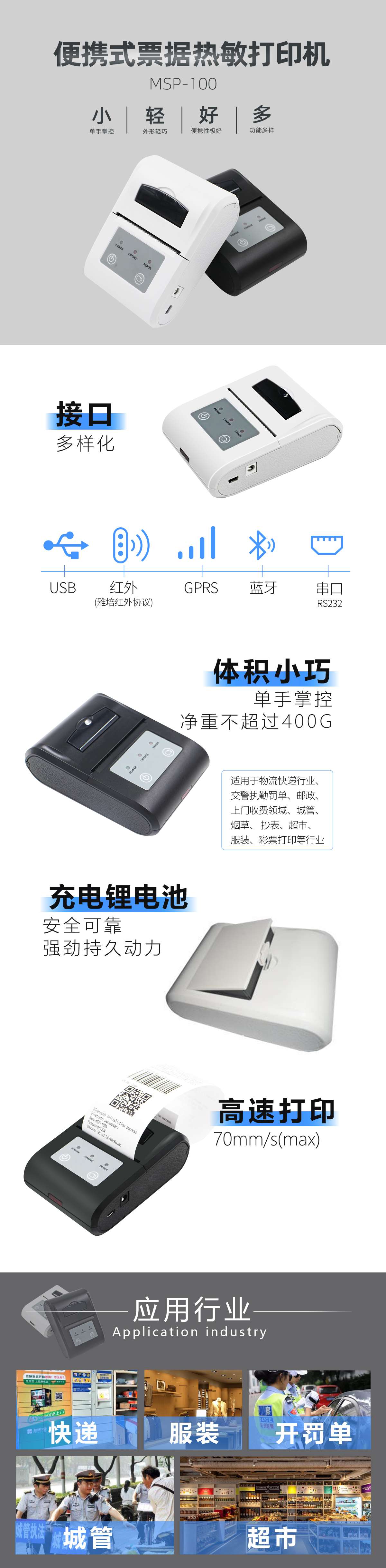 美松MSP-100打印機58mm微型熱敏POS小票據(jù)打印機,支持紅外(雅培紅外協(xié)議)接口,GPRS接口,USB接口,藍牙接口,串口RS232接口,鋰電池充電,適應(yīng)用于物流快遞行業(yè),交警執(zhí)勤罰單,郵政,上門收費領(lǐng)域,城管,煙草,抄表,超市,服裝,彩票打印等行業(yè)的使用.支持多種一維條形碼&二維碼功能的打印,支持GB18030漢字庫,可高速打印漢字.