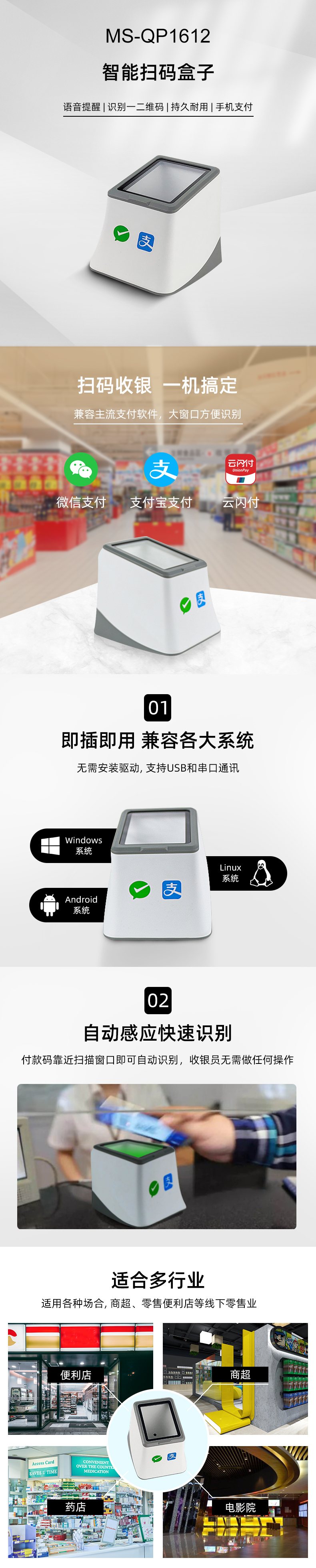 1.大窗口,經(jīng)典外觀(guān),支持貼屏掃碼 2.支持微信、支付寶、美團(tuán)等掃碼支付 3.掃碼成功語(yǔ)音播報(bào) ,解放收銀員,避免漏單 4.接口豐富,內(nèi)置RS232 和USB接口