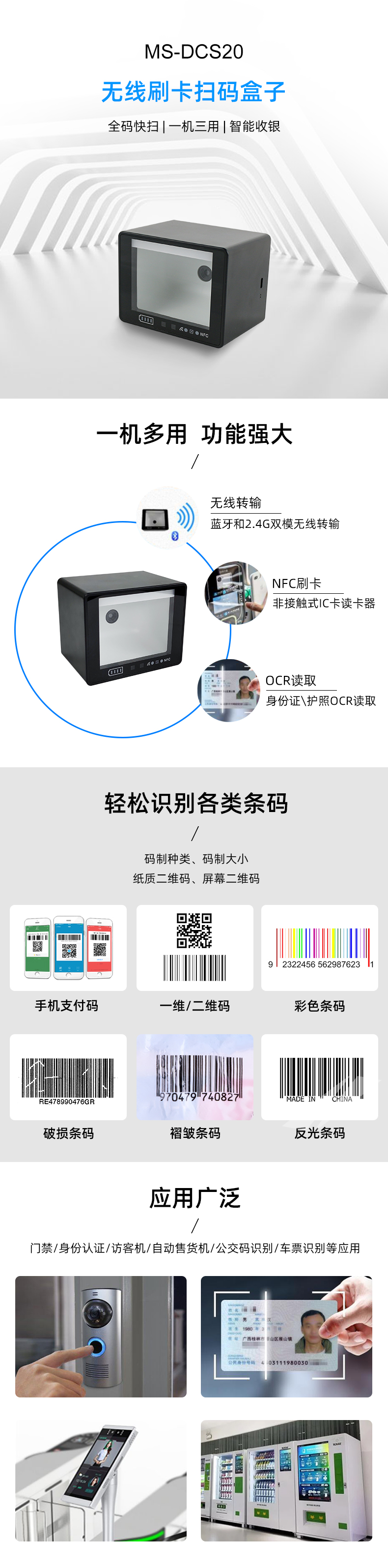 二維碼掃描器行業(yè)應(yīng)用:二維碼掃描器MS-DCS20可桌面亦可嵌入、會議簽到、訪客機(jī)、門禁、身份認(rèn)證、身份證護(hù)照OCR讀取,支付、醫(yī)療自助、排隊機(jī)等,尤其適用于高密紙質(zhì)、手機(jī)碼、要求貼近掃描、需要讀身份證OCR、刷IC卡、無線傳輸應(yīng)用的場景。二維碼掃描器MS-DCS20實(shí)現(xiàn)藍(lán)牙和2.4G雙模傳輸;選配刷卡模塊可支持13.56Mhz 非接觸式 IC 卡讀卡器,支持 Type A/B 卡識讀;OCR讀取可讀取OCR-A/B數(shù)字,領(lǐng)先的解碼技術(shù),采用自主研發(fā)的核心技術(shù),極速響應(yīng),支持快速開發(fā)和定制需求。