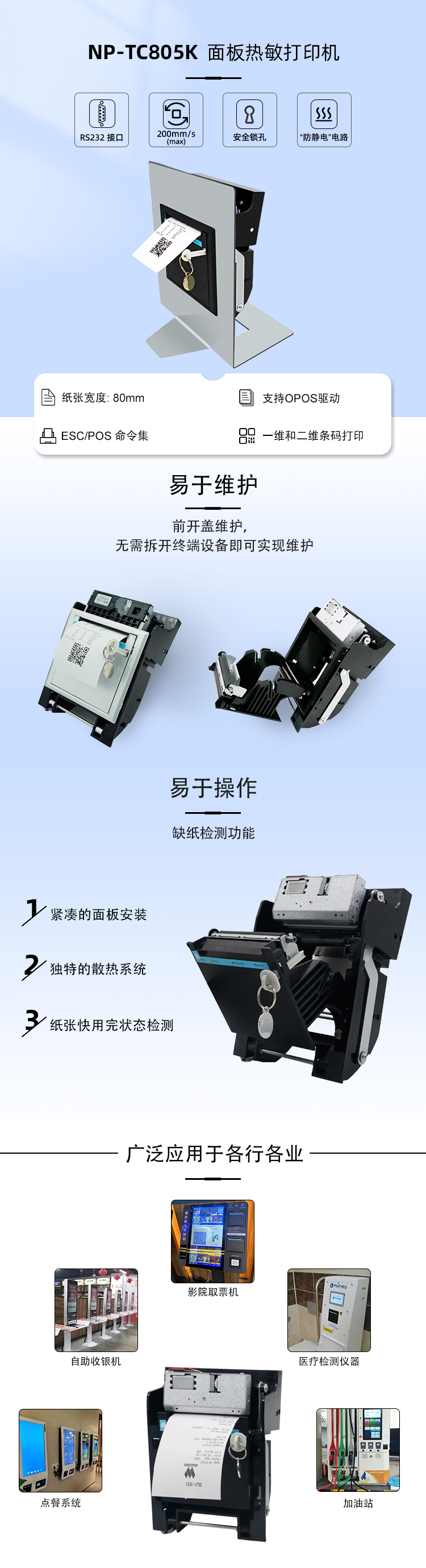 1.超薄機身設(shè)計,專用于高度集成的終端服務(wù)設(shè)備 2.紙倉最大化設(shè)計,80*80大紙卷,避免頻繁換紙 3.開蓋方式多樣化:按鍵,鑰匙和電子鎖開蓋 4.前維護式,不需要打開機柜換紙 5.分為有邊框和無邊框,無邊框更易嵌入在終端服務(wù)設(shè)備
