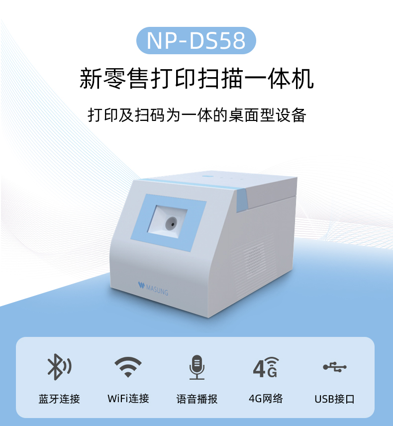 在新零售行業(yè)廣泛應(yīng)用的打印掃描一體機NP-DS58,同時兼顧打印和掃描兩種功能的一體式設(shè)備,具有藍(lán)牙連接和wiff連接等連接方式,帶有4G網(wǎng)絡(luò)接口,和USB接口連接,收銀掃碼都十分方便,帶有語音播報功能,更方便收銀結(jié)賬。