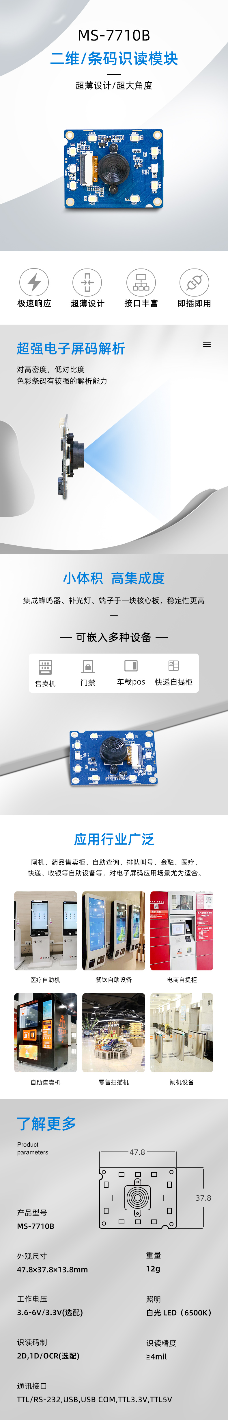 兼具一維/二維碼;紙質(zhì)和手機(jī)碼掃描 3.9mil精度條碼掃描 工業(yè)級(jí)電路防護(hù)設(shè)計(jì) 十字激光光標(biāo)指示 OCR身份證號(hào)碼讀取功能(選配) 選配轉(zhuǎn)接板可端子線連接RS232,TTL3.3V,TTL5V,USB,USB虛擬串口