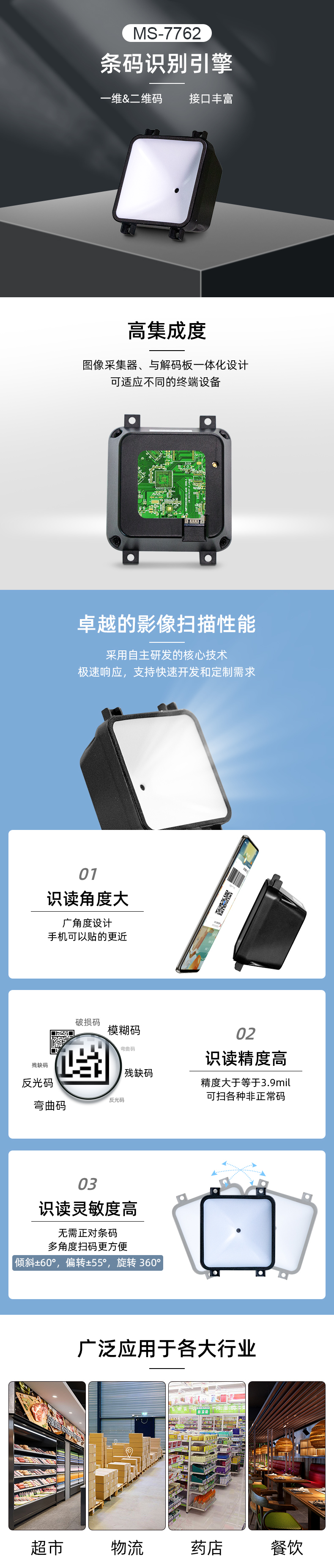兼具一維/二維碼;4mil紙質(zhì)和手機碼掃描 支持“貼面”和快速移動過程中識讀 內(nèi)置RS232\USB接口和蜂鳴器 28MM超薄設(shè)計更宜集成 支持陽光下和完全黑暗環(huán)境識讀