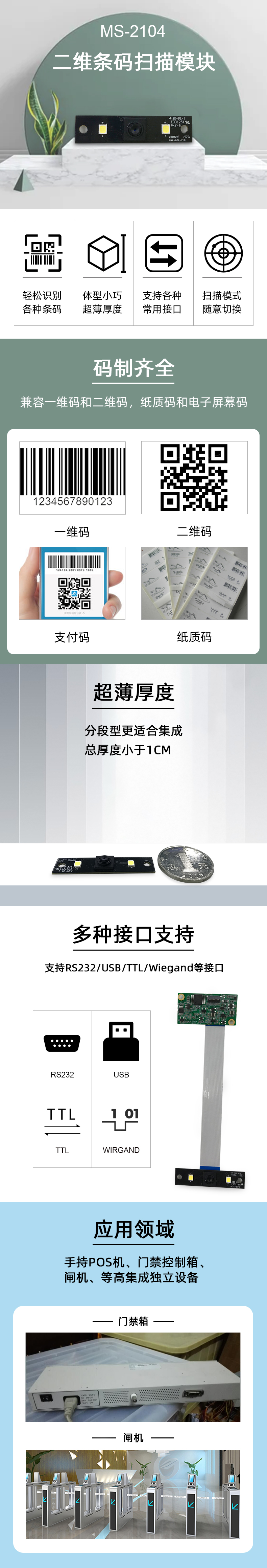 美松固定式二維掃描模組MS-2104掃描采用廣角鏡頭,適合近距離識讀,支持紙質和電子屏,支持全碼制條碼識讀,增加陽光下濾鏡算法,非常適合門禁和陽光下的應用.自帶補光燈,無需另外配備.采用鏡頭和解碼板分離,厚度低于1CM,結構更自由,非常適合超薄結構件的設計.豐富接口類型兼容USB,RS232,485,TTL3.3/5V,韋根;寬壓設計3.3-16V,寬溫設計,支持-30~70℃環(huán)境下使用.