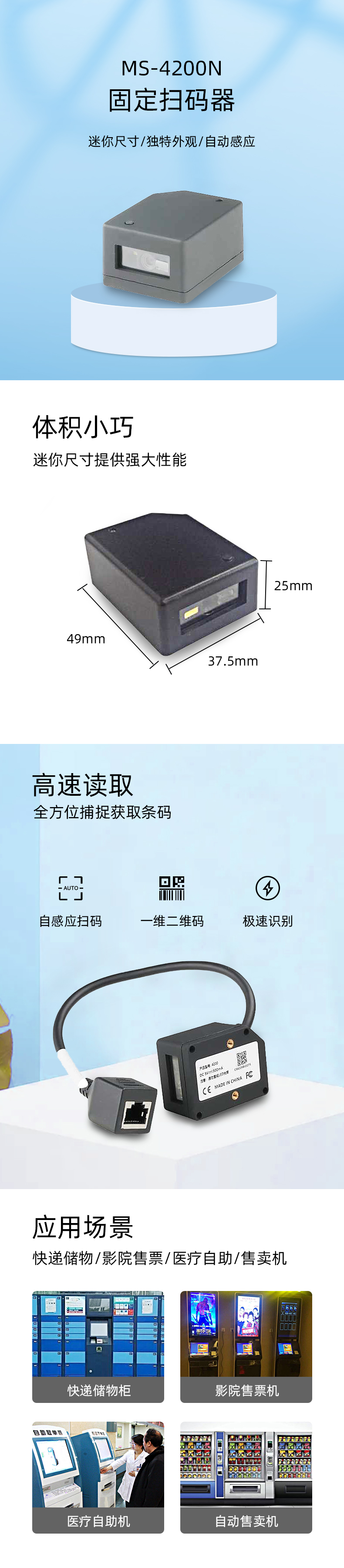 美松嵌入式二維碼條碼掃描器 1.兼容紙質(zhì)和電子屏,一維和二維條碼均可識讀 2.自帶補光燈掃描基準線,更易掃面單類紙質(zhì)條碼 3.體積非常小巧,非常適合手持機和空間狹小情況下使用,自帶蜂鳴器提醒