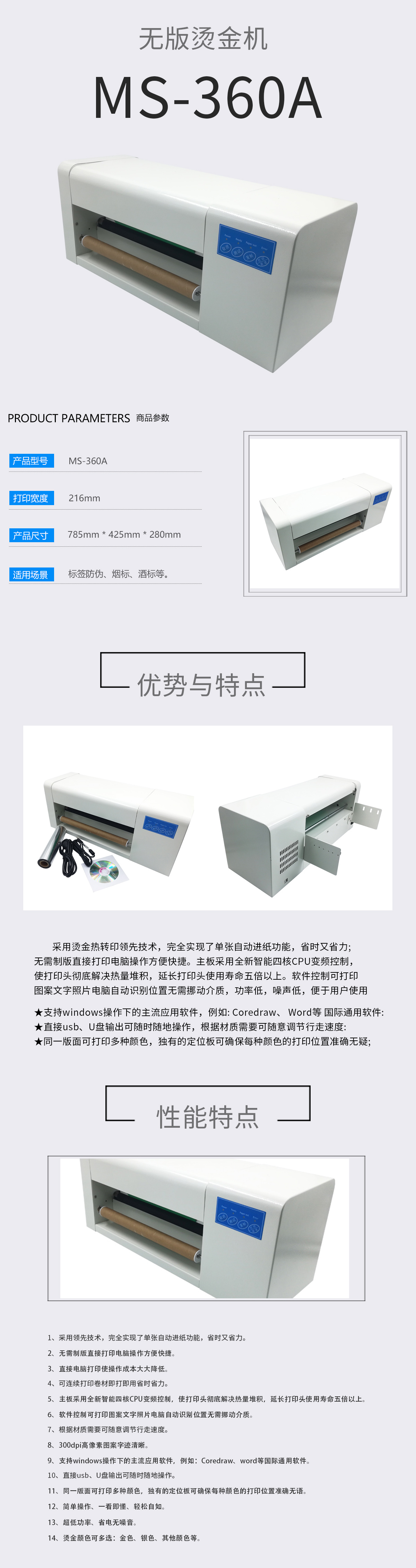 美松數(shù)碼無版燙金印花機 1.完全實現(xiàn)了單張自動進紙功能,省時又省力 2.直接usb,U盤輸出,無需制版直接打印電腦操作方便快捷 3.可連續(xù)打印卷材,即打即用,省時省力 4.全新智能四核CPU變頻控制,使打印頭徹底解決熱量堆積,延長打印頭使用壽命五倍以上