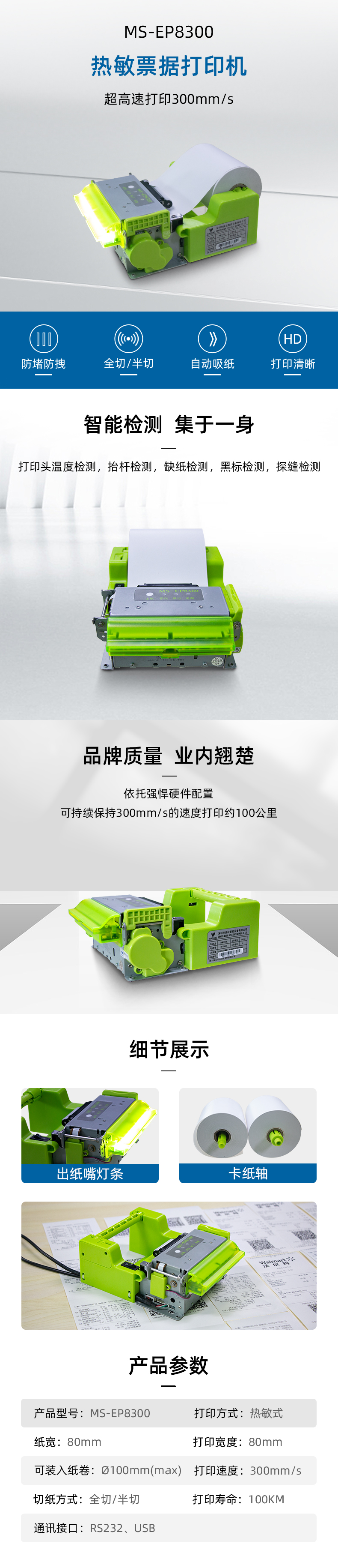 以“清新綠”作為主色新一輪創(chuàng)新的美松特色產(chǎn)品上市,在顏色上凸顯清新脫俗的生命力和綠色環(huán)保低碳的生活理念,讓人耳目一新; 在高效率打印技術(shù)上也突破了以往的打印速度,高配版本達(dá)到300mm/s,在保證打印質(zhì)量的同時(shí),超快打印速度 打印頭側(cè)翻蓋設(shè)計(jì),維護(hù)簡(jiǎn)單; 增加防堵紙檢測(cè)傳感器等功能,打印工作將故障排除在千里之外; 搭配100毫米直徑的紙卷,減少換紙頻率; 優(yōu)化外觀設(shè)計(jì),選擇優(yōu)質(zhì)圓潤的塑膠外殼,操作使用更加安全可靠; 一款打印寬度為80mm的熱轉(zhuǎn)印打印機(jī),最大紙卷寬度為100mm