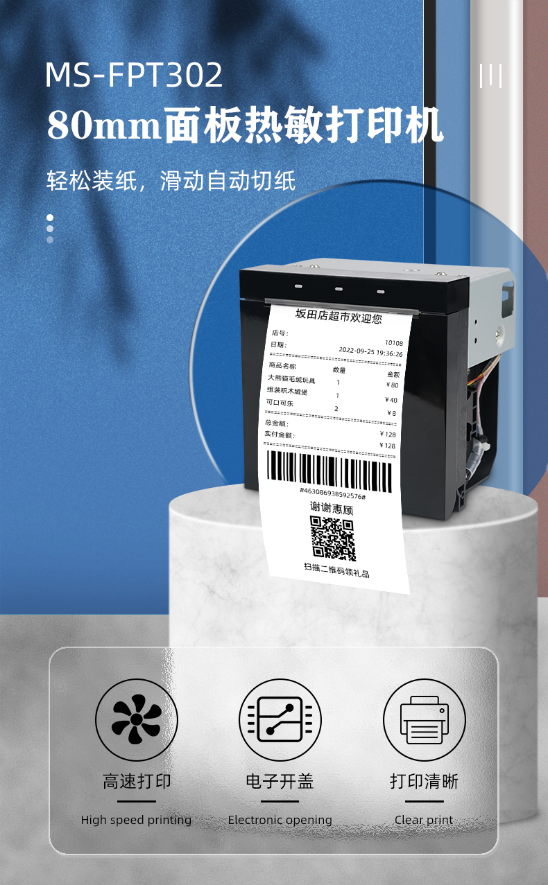 MS-FPT302是一款面板嵌入式自助打印機,專業(yè)的熱敏票據(jù)打印機,用于醫(yī)療、零售、政務(wù)等行業(yè)的自助終端設(shè)備。水平面蓋嵌入,高端大氣,無人值守打印機適配無人無接觸式服務(wù)設(shè)備。