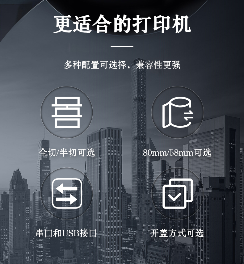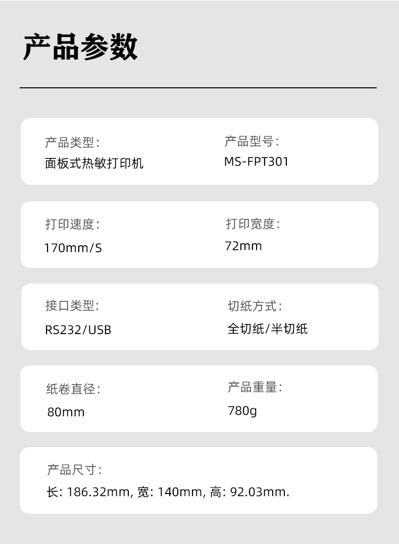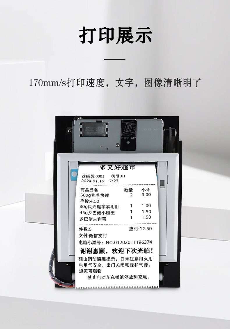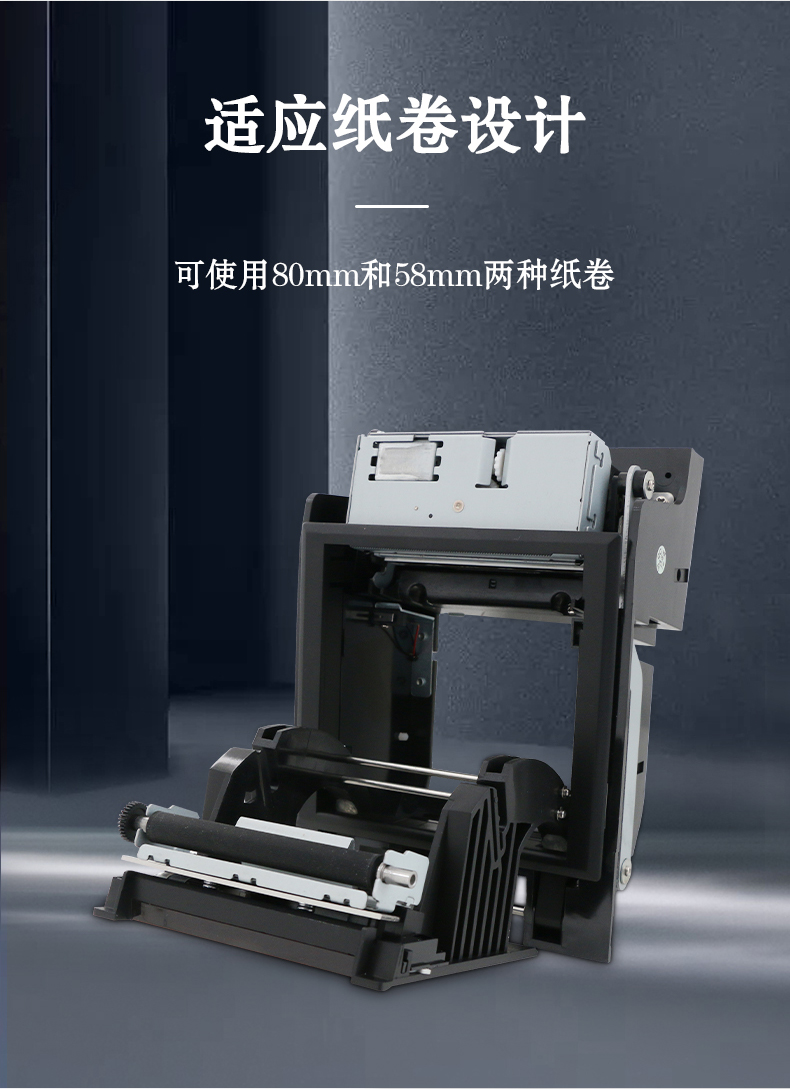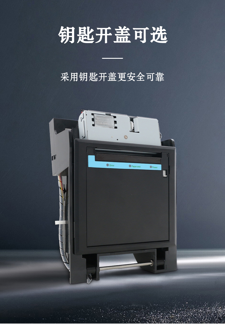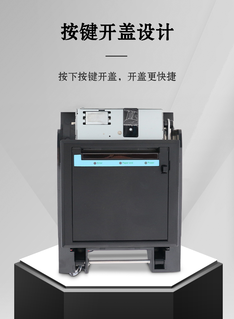 1.超薄機身設計,專用于高度集成的終端服務設備 2.紙倉最大化設計,80*80大紙卷,避免頻繁換紙 3.開蓋方式多樣化:按鍵,鑰匙和電子鎖開蓋 4.前維護式,不需要打開機柜換紙 5.分為有邊框和無邊框,無邊框更易嵌入在終端服務設備