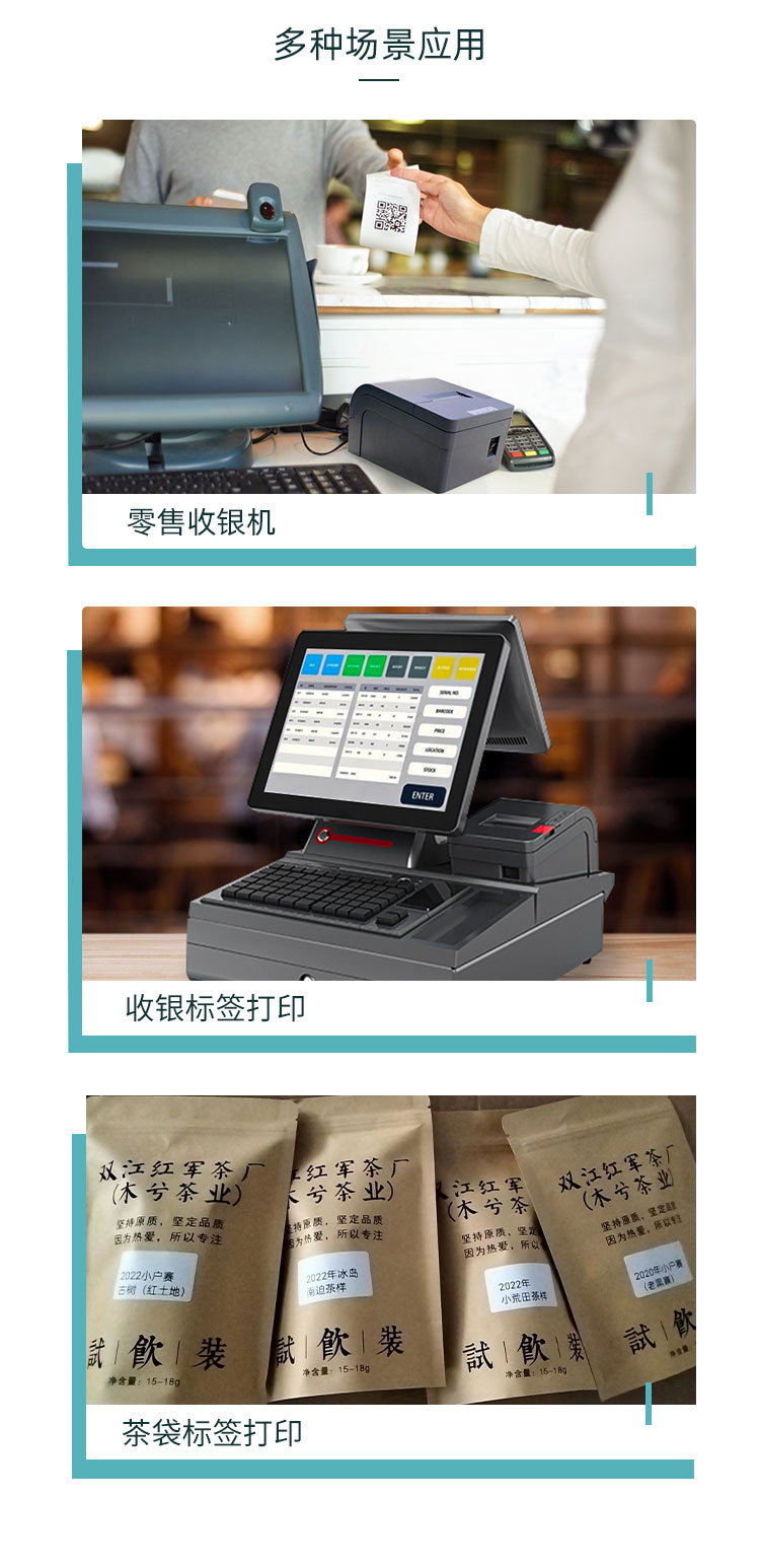 可以打印熱敏票據(jù)紙和熱敏不干膠紙,適合市面上絕大多數(shù)的打印需求。 支持條碼打印、標(biāo)簽打印、不干膠打印、熱敏紙打印、收銀紙打印、價(jià)簽打印等多種打印方式。 可裝入50mm直徑的紙卷,具有USB、Wiff、串口、并口、藍(lán)牙等通訊方式可選, 58mm桌面式熱敏不干膠標(biāo)簽打印機(jī),可適用于多種場合,進(jìn)行標(biāo)簽打印,商超零售貨架標(biāo)簽,水果店鋪價(jià)格標(biāo)簽,購物稱重標(biāo)簽,醫(yī)療標(biāo)簽。