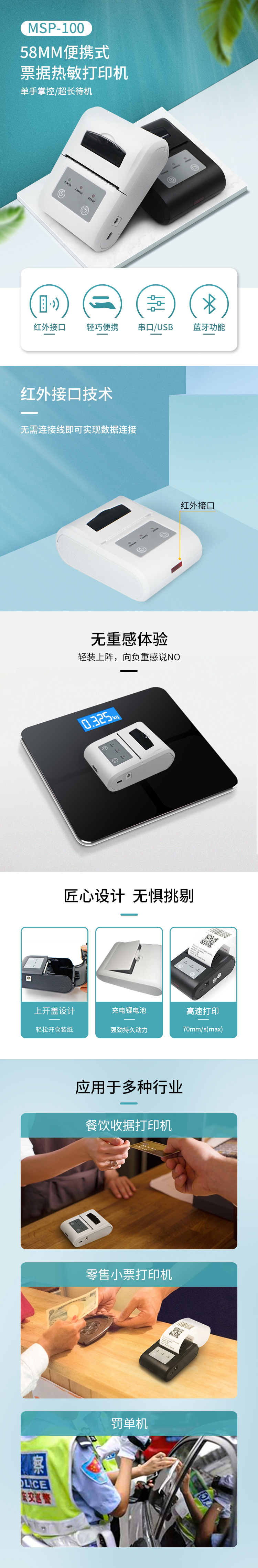 MSP-100作為一款便攜式的打印機,在各種商鋪中也能輕松駕馭,MSP-100具有超多的接口類型比如:串口、USB(安卓/Windows),藍牙,紅外,GPRS,可以輕松的連接,從而實現(xiàn)打印各種各樣的票據(jù),同時MSP-100的體型十分小巧,可以輕松的使用,而無需占用過多的空間。