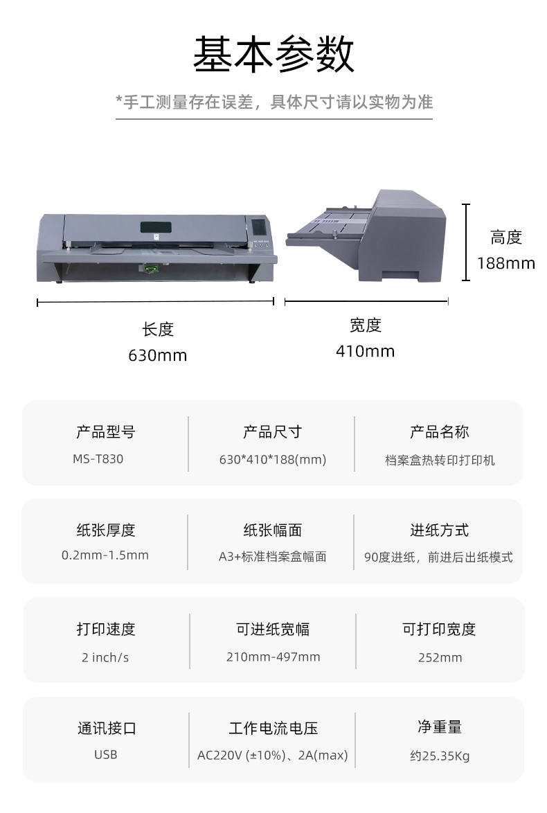 美松MS-T830檔案盒熱轉(zhuǎn)印打印機,熱轉(zhuǎn)印設(shè)備,熱轉(zhuǎn)印機器針對已印刷的檔案盒封面進行二次加印,或單張空白版面牛皮紙,無酸紙,證件內(nèi)頁進行打印的設(shè)備.采用碳帶熱轉(zhuǎn)印方式打印,文字清晰耐刮永不褪色.電腦排版完即可通過USB打印無需制版,A3+標(biāo)準(zhǔn)檔案盒幅面,方便快捷成本低廉,機構(gòu)可靠性高,操作,維護簡單.適用于公檢法,檔案局,審批局,醫(yī)療診所,教育機構(gòu),煙草,房產(chǎn)管理,電力,鐵路等行業(yè)。