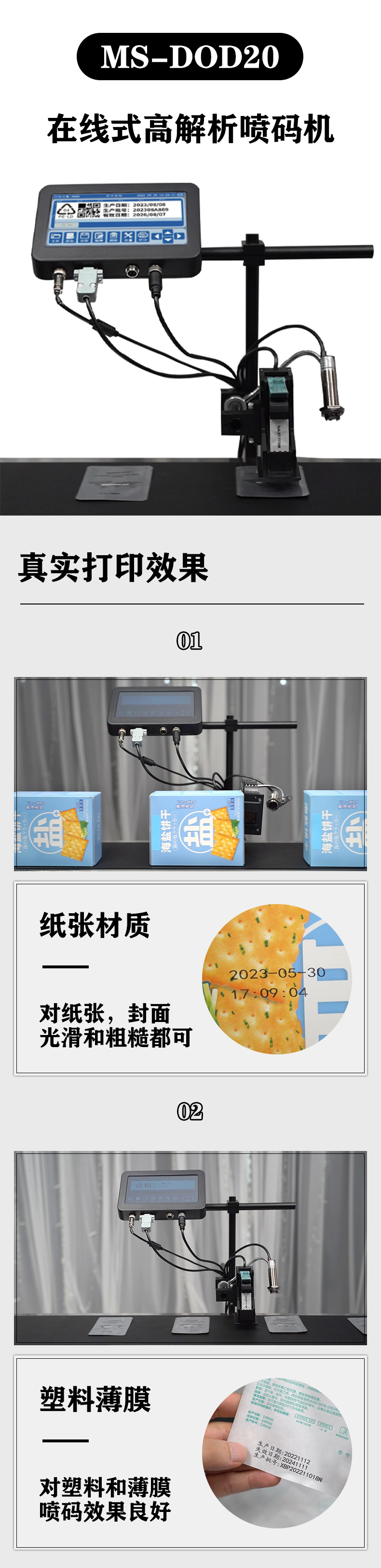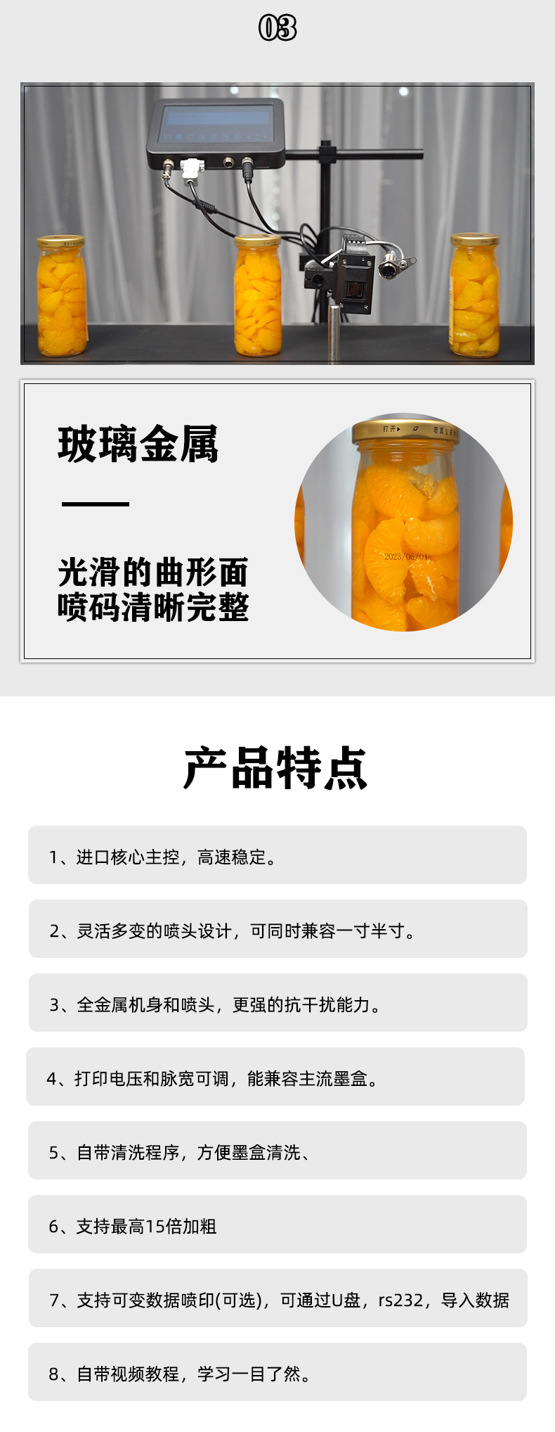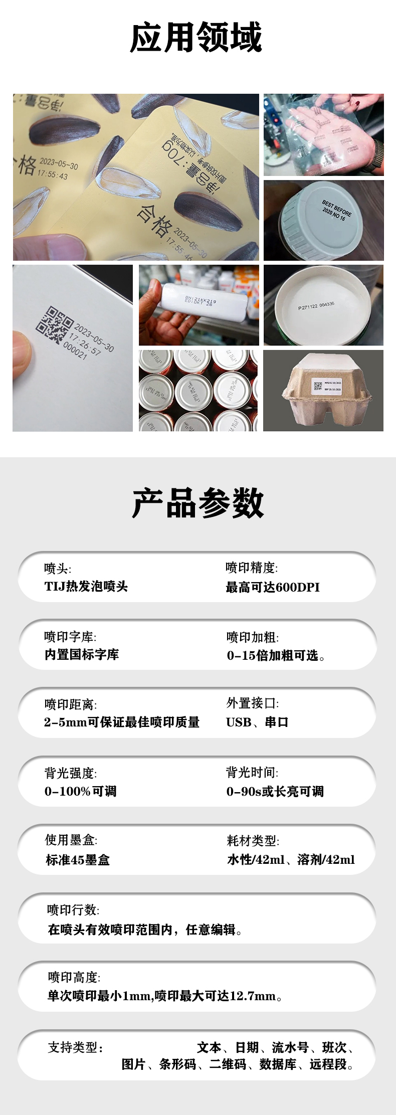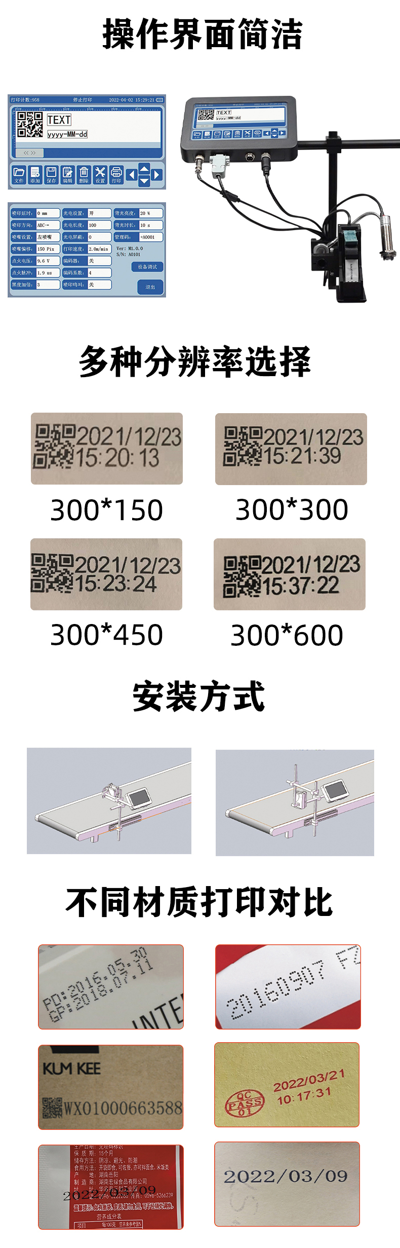 1、進口核心主控,高速穩(wěn)定。 2、靈活多變的噴頭設計,可同時兼容一寸半寸。 3、全金屬機身和噴頭,更強的抗干擾能力。 4、打印電壓和脈寬可調,能兼容主流墨盒。 5、自帶清洗程序,方便墨盒清洗、 6、支持最高15倍加粗 7、支持可變數據噴印(可選),可通過U盤,rs232,導入數據 8、自帶視頻教程,學習一目了然。