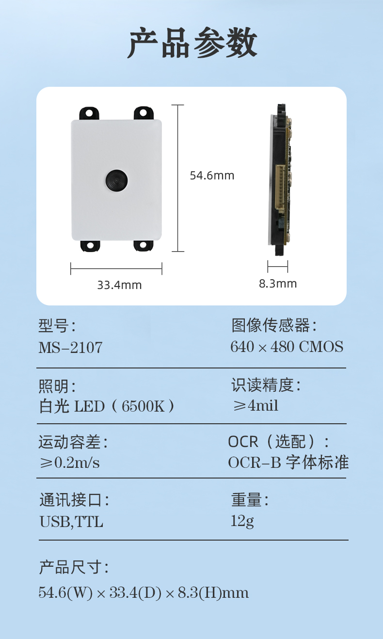 采用自主研發(fā)的核心技術(shù),極速響應(yīng),支持快速開發(fā)和定制需求 角度設(shè)計,手機(jī)可以貼的更近 整機(jī)厚度僅 8.3MM,更方便集成 對高密,低對比度,色彩條碼有較強(qiáng)的解析能力 多種接口協(xié)議:USB、USB COM、TTL232、RS232、TTL3.3V、TTL5V 等接口 集成蜂鳴器、補(bǔ)光燈、端子于一塊核心板,穩(wěn)定 性更高 可選配 OCR-B 規(guī)范字符識讀 車載 POS、閘機(jī)、門禁、電商自提柜、藥品售賣柜、自助查詢、排隊叫號、金融、 醫(yī)療、快遞、收銀等自助設(shè)備等,對電子屏碼應(yīng)用場景尤為適合。