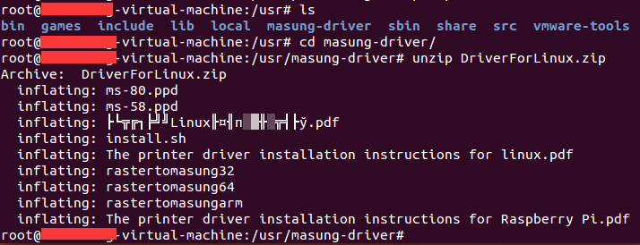 進(jìn)入 masung-driver 目錄,然后使用 unzip 命令解壓驅(qū)動(dòng)程序。