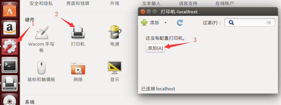 1打開(kāi)系統(tǒng)設(shè)置,2點(diǎn)擊打印機(jī),3點(diǎn)擊添加。