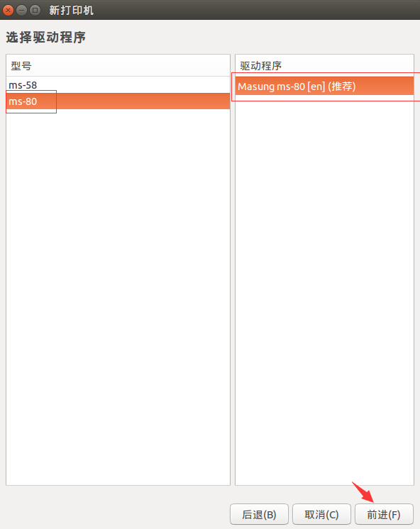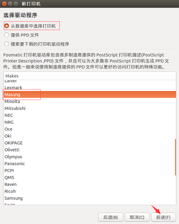 選擇 “從數(shù)據(jù)庫(kù)中選擇打印機(jī)”,并選擇 “Masung”,然后點(diǎn)擊前進(jìn)。