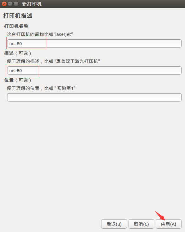 設(shè)置打印機(jī)名稱(自定義)和打印機(jī)描述(自定義),然后點(diǎn)擊應(yīng)用即可。